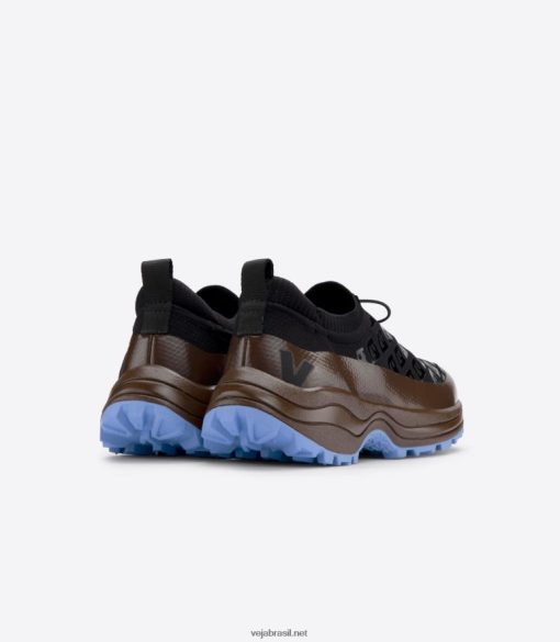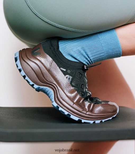 inspirado no ar livre com uma sola grossa todo-o-terreno, seu design é semelhante a um confortável tamanco. com um aceno irônico para marcas de luxo e falsificações, amelie pichard e veja adicionaram um padrão de monograma à sua parte superior elástica.